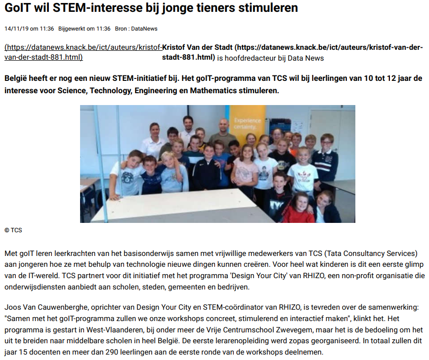 Design Your City van RHIZO is de partner van het GoIT-programma van TCS om bij jongeren de interesse voor IT en STEM aan te wakkeren!